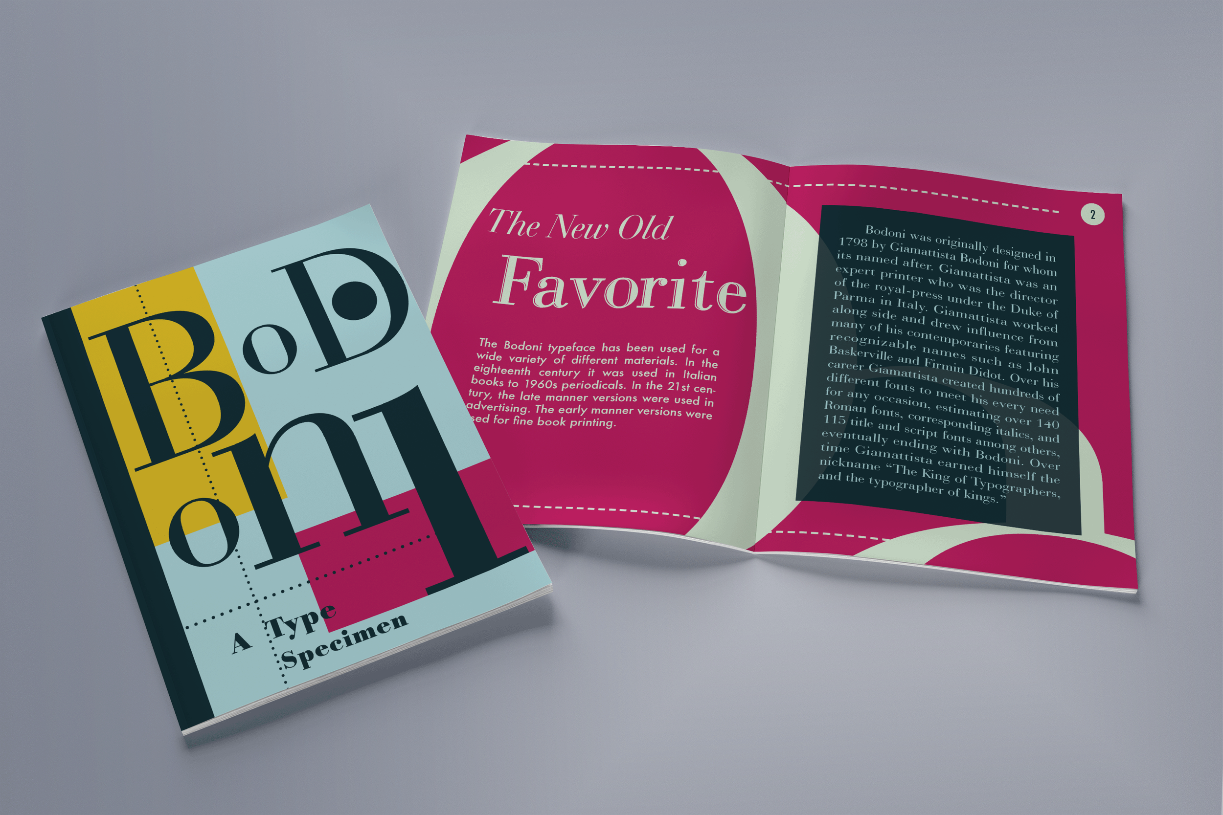 The booklet shows the ins and outs of the Bodoni typeface to educate designers on its history and utility. This booklet breaks down the various fonts, sizes, and letter anatomy of the typeface, highlighting the differences between similar typefaces.